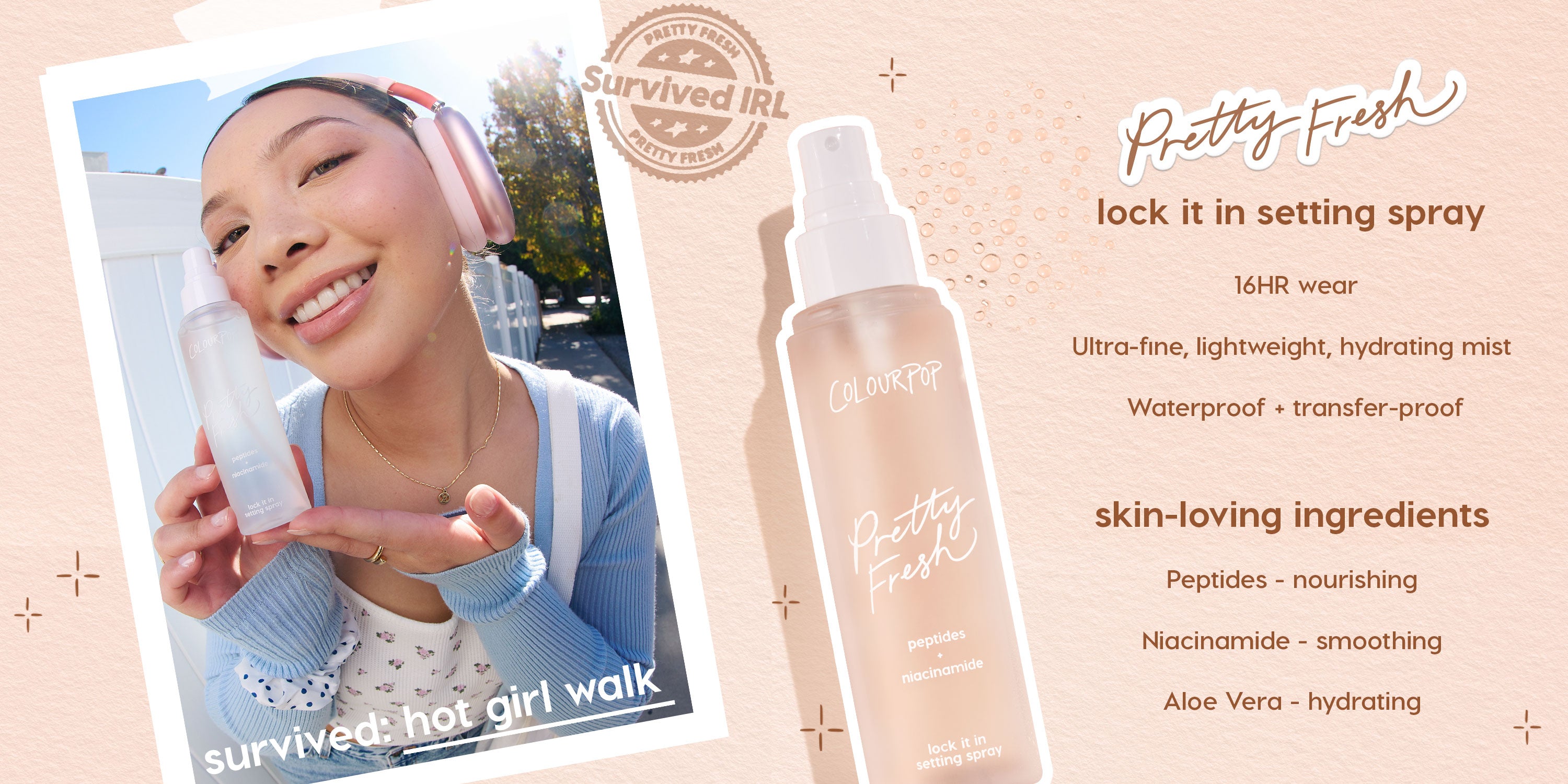 Survived IRL from morning ballet to dinner with bestie! Lock It In Setting Spray is an ultra-fine waterproof + transfer-proof mist that locks your makeup in place for 16 hours with skin-loving ingredients. It sets your look with with a natural finish while boosting hydration. Infused with nourishing Peptides, smoothing Niacinamide and hydrating Aloe Vera.