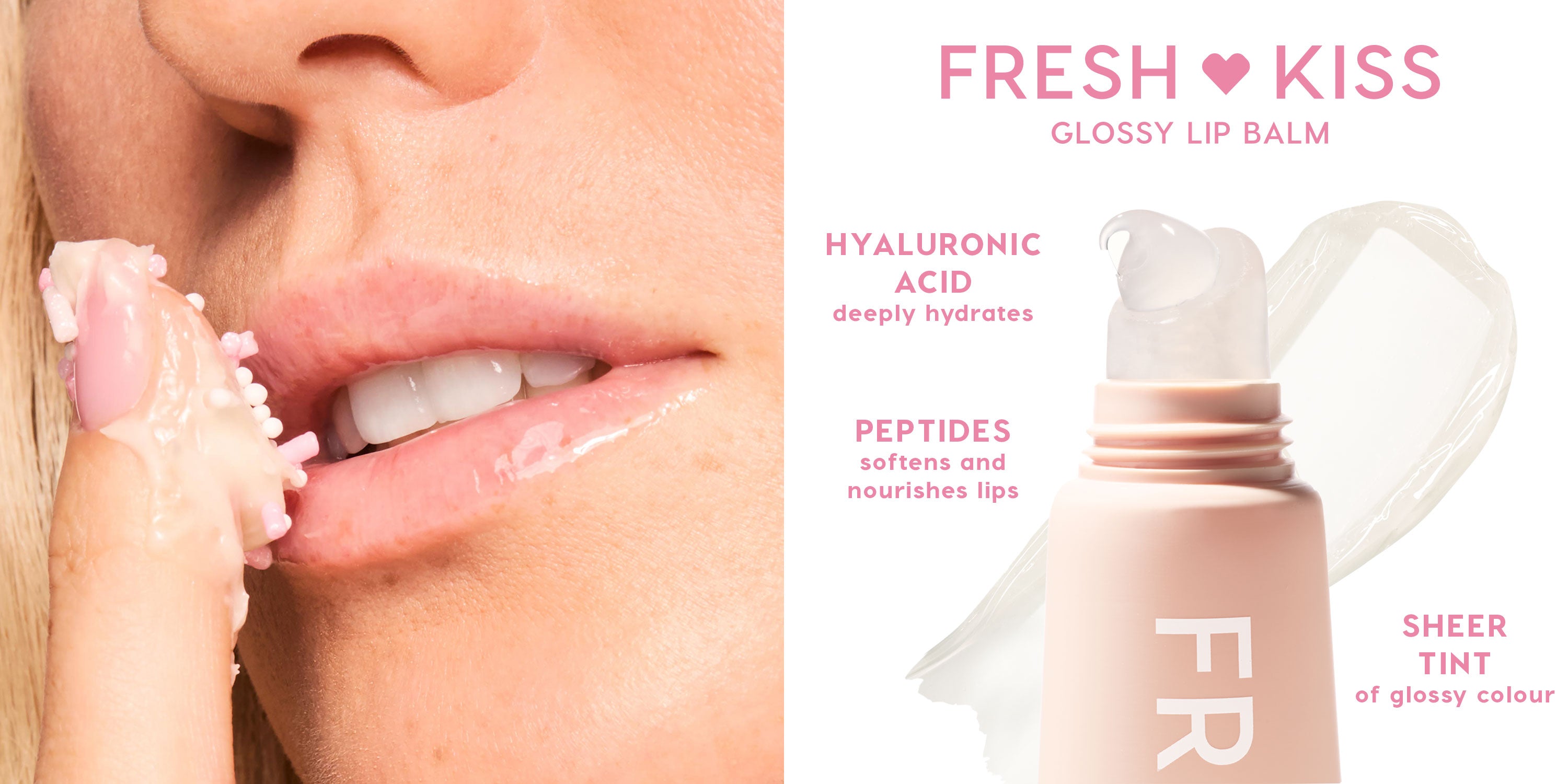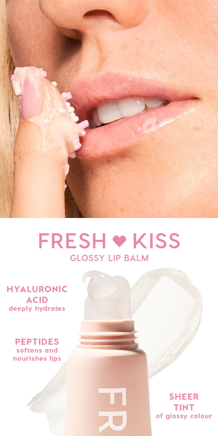 ColourPop Fresh Kiss Glossy Balm, Vanilla Cake, stands upright against a frosted vanilla cake slice topped with pink sprinkles, blush tube with white lettering styled on a bright, reflective surface for a sweet, high-shine lip finish. Glossy, sheer pink lips wearing ColourPop Fresh Kiss Glossy Balm in Vanilla Cake, showing a high-shine finish on a close-up model face with soft waves and natural makeup against a bright studio background.