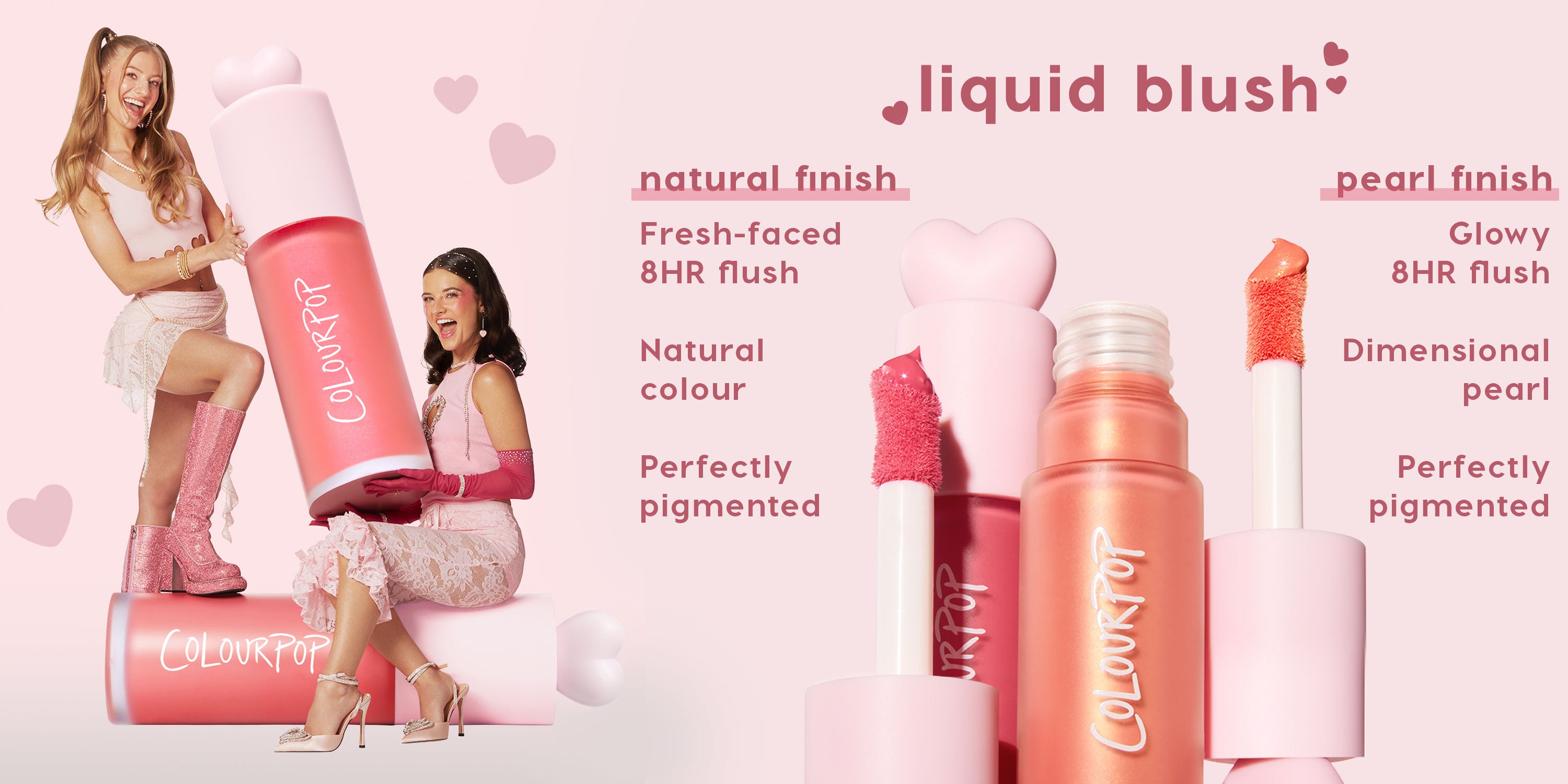 Two smiling women wear Colourpop City Walk liquid blush on their cheeks, one in a dewy pearl finish and the other in a soft natural finish, posing close together against a pink background with the slogan “sisters, not twins – they’re two of a kind.”