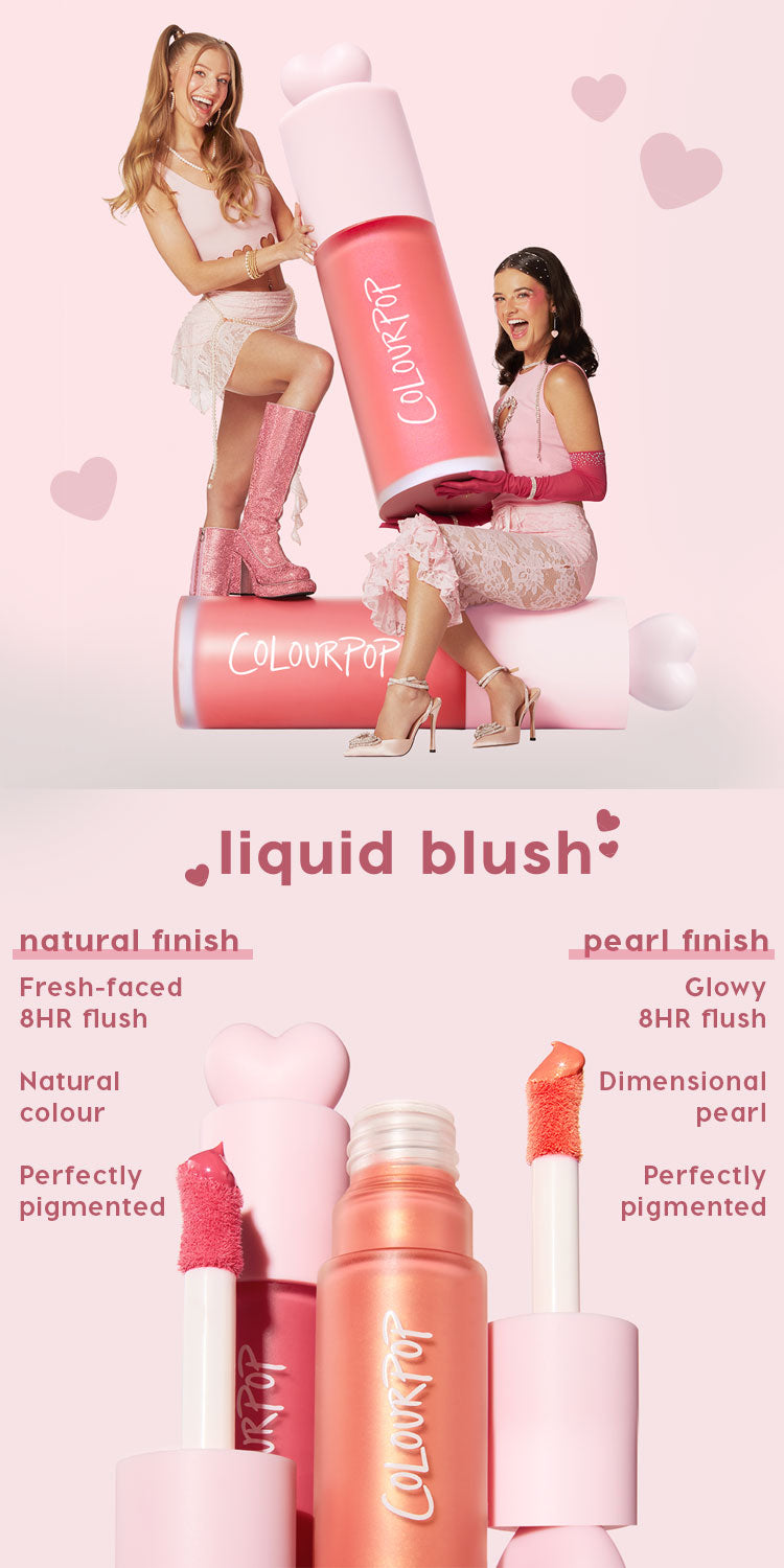 ColourPop Liquid Blush Wine n’ Dine dispenses from an open tube with a pink heart-shaped cap and doe-foot applicator coated in a deep wine, pearly blush, set on a white background with an Allure Best of Beauty 2025 award badge. Wine n' Dine ColourPop Liquid Blush creating a dewy berry glow on a smiling model’s cheeks in a close-up, highlighting glossy skin and a radiant sheen for everyday glam. Two smiling women wear Colourpop City Walk liquid blush on their cheeks, one in a dewy pearl finish and the other in a soft natural finish, posing close together against a pink background with the slogan “sisters, not twins – they’re two of a kind.” City Walk ColourPop Liquid Blush swatched on a doe-foot wand, warm nude with silver pearl finish, displayed at the bottom of a six-shade lineup on a pink backdrop. City Walk ColourPop Liquid Blush arm swatch shown on three skin tones, alongside labeled shades Perfect Peach, I Love It, Princess Ave, Sweet Treat, and Wine N’ Dine, highlighting the pearl finish, smooth pigment, and shade comparison. Wine n’ Dine ColourPop Liquid Blush dotted from a doe-foot wand and blended to a luminous berry‑pink glow, shown in a three-panel before–during–after cheek application, showcasing its buildable, pearly finish and fingertip blending. City Walk ColourPop Liquid Blush blended with a brush and tapped with a makeup sponge on two models’ cheeks, showing a dewy, pearly glow and buildable pigment in a split-screen close-up that demonstrates brush vs. sponge application. ColourPop Liquid Blush City Walk with pearl displayed in pink gradient tubes and an open doe‑foot applicator showing a peachy coral shimmer, set on a pink backdrop highlighting 8‑hour wear, minimized pores, plump cheeks, and all‑day hydration. City Walk liquid blush by ColourPop, a rosy pink formula in a frosted bottle with a heart-shaped cap, tilts beside SOL Body liquid sun glow drops and a gold shimmer tube on a pastel pink background, promoting bronzing, glowing, and blushing. ColourPop Liquid Blush in Wine n' Dine, open frosted burgundy bottle with pink doe-foot applicator swiping a metallic wine-rose heart swatch on a pale pink backdrop, showcasing the shimmery, blendable liquid formula. Wine n' Dine ColourPop Liquid Blush swatch spreads in a single glossy swipe, revealing a shimmery berry-wine to rose gradient with fine micro-sparkle and a satin sheen on a clean white background.